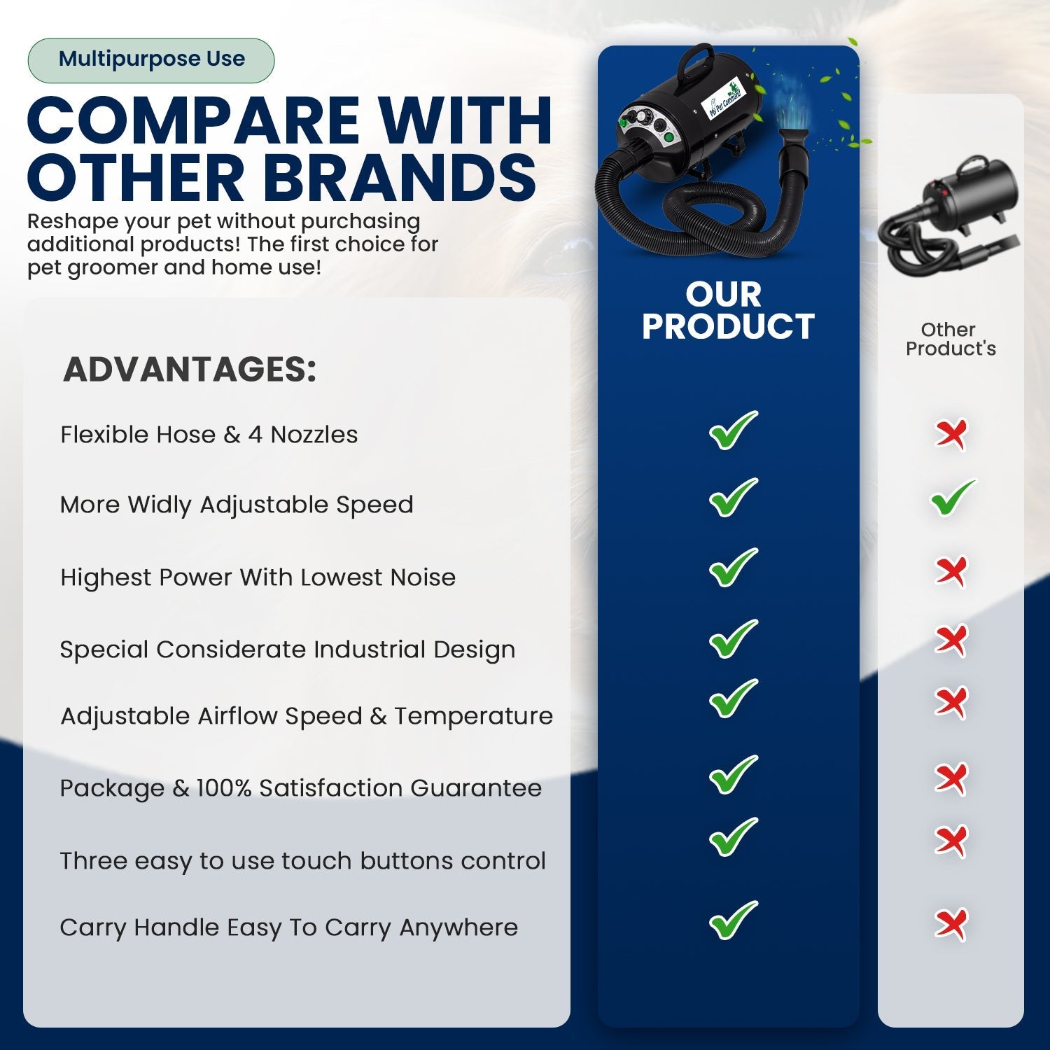 My Pet Command's commercial-grade quality Dog Hair Dryer for your pet is a 110v portable and adjustable hot/cold airflow, high-velocity blower yet very quiet.